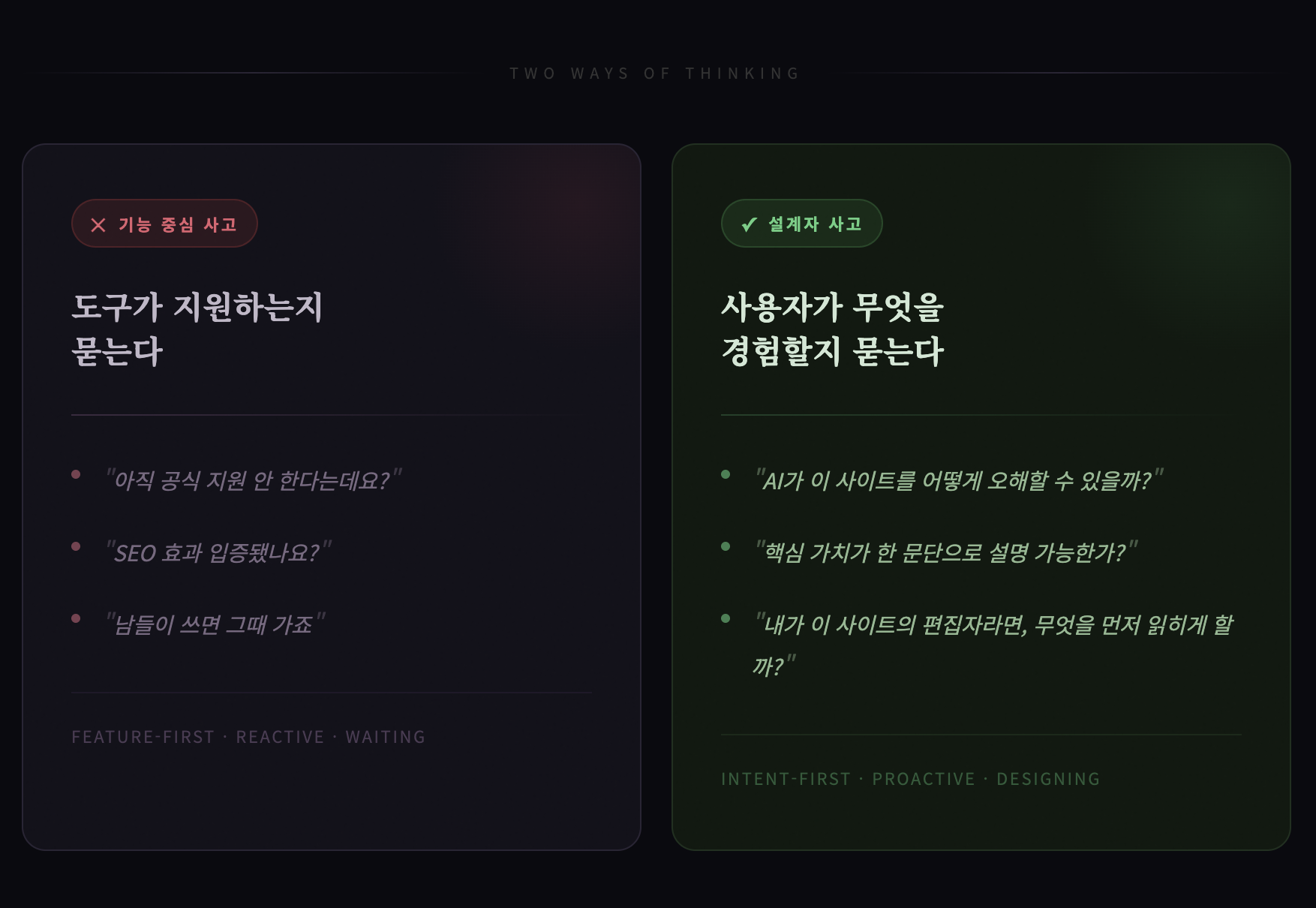 이러한 질문에 대한 명확한 답변을 도출하지 못한다면, 문제는 llms.txt 파일 자체보다는 웹사이트의 사고 구조에 있을 가능성이 높습니다.