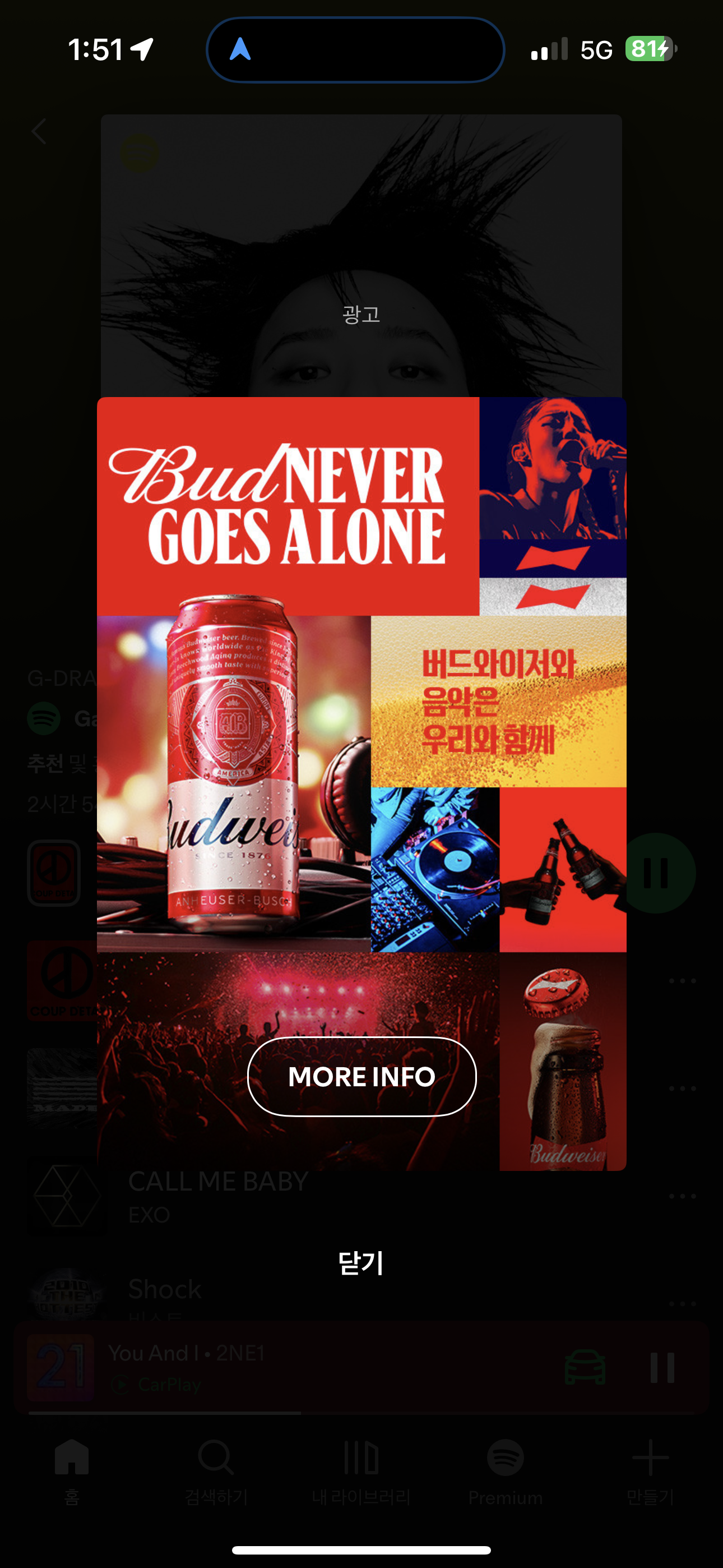 스포티파이 광고는 앱 내에서 실행되며, 오디오와 함께 배너도 동시에 노출됩니다.
